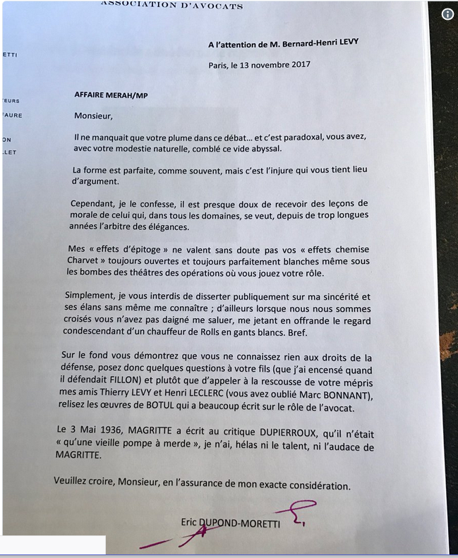 Il y a 8 jours, dans le Journal le Point, le philosophe autoproclamé BHL, sans doute frustré de n’avoir pas eu de journaliste à sa porte depuis trop longtemps s’était fendu d’un pamphlet à l’encontre d’EDM, critiquant ouvertement la posture prise par un avocat dans ce procès auquel il n’avait même pas assisté.