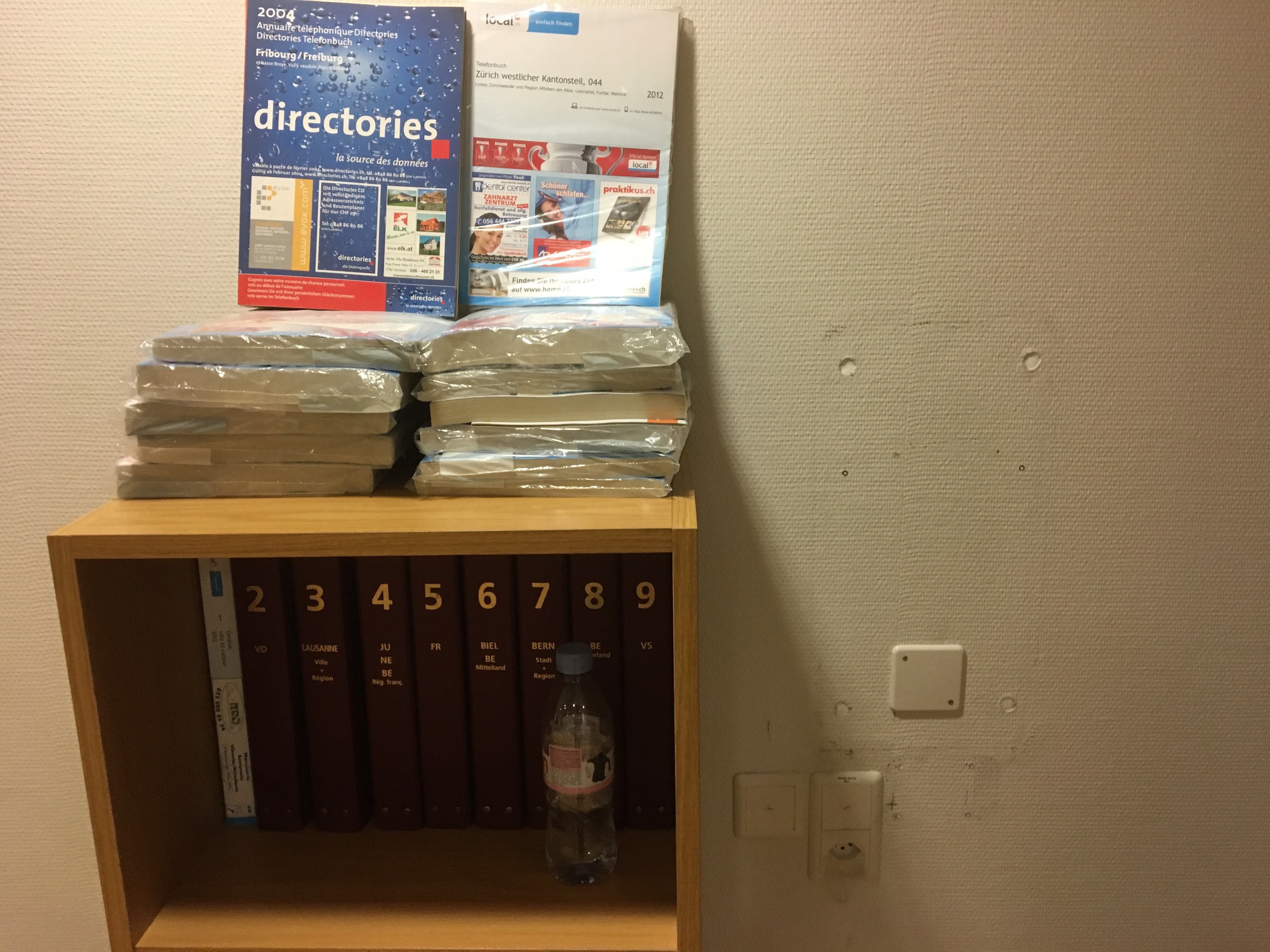 Si l’on se risquait à glisser à l’huissier une petite remarque du genre, vous ne pensez pas que ce serait bien de les enlever ? Des bottins de 2004 et 2012, sans téléphone, ça fait un peu désordre, non ? Nul doute que la réponse serait : Le téléphone, c’est Swisscom qui a décidé de l’enlever, nous, on n’a pas de budget pour ça…